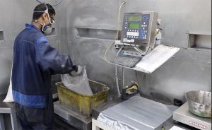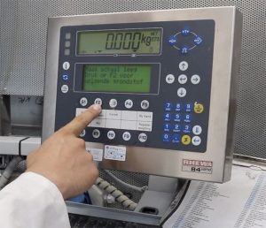De operator scant een werkordernummer in en het weegsysteem geeft achtereenvolgens de te doseren ingrediënten aan.