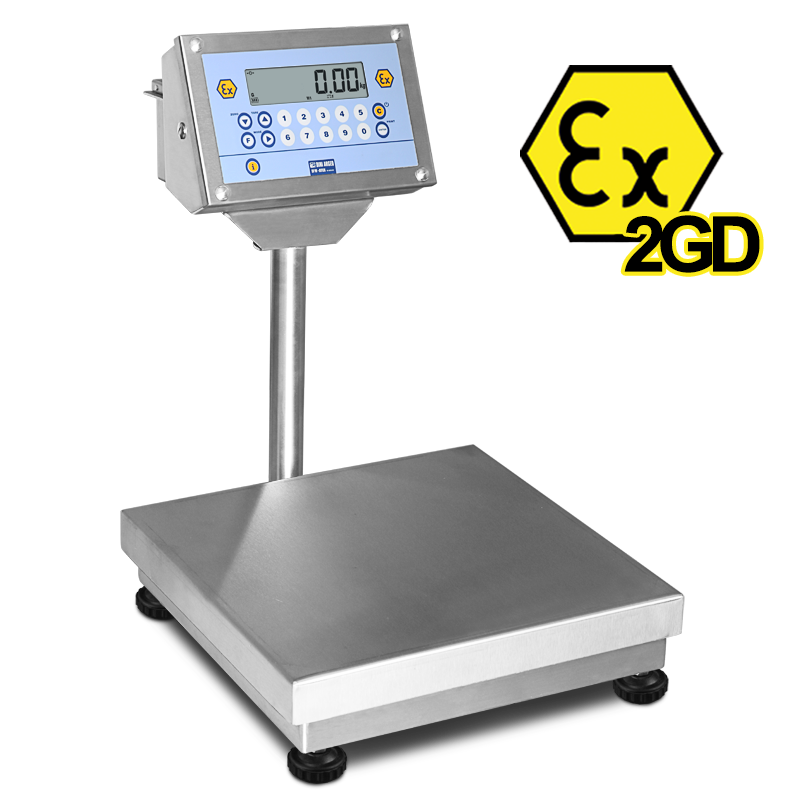 Volledig roestvrijstalen bankweegschaal, voor specifiek gebruik in ATEX gevaarlijke zones. Deze weegschaal wordt gevoed door een duurzame oplaadbare batterij. Deze weegschalen hebben geen stopcontact in gevaarlijke zone nodig, noch ATEX-veilige voedingskabels. Voorzien van de ATEX-verklaring van conformiteit. Ex II 2G IIC T4 Gb X en Ex II 2D IIIC T197°C Db X bescherming.