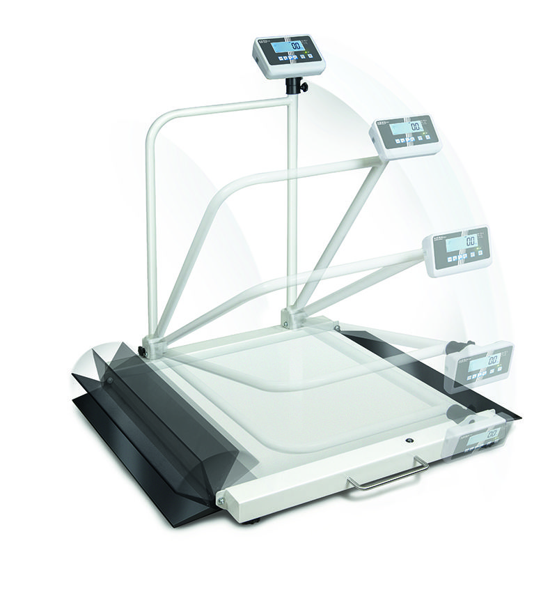 • MWA 300K-1PM: Rolstoelweegschaal met praktische greepbeugel incl. statief voor een ergonomisch voordelige montage van de afleeseenheid. De beugel geeft de patiënt een gevoel van meer veiligheid bij het oprijden of betreden van het weegplateau