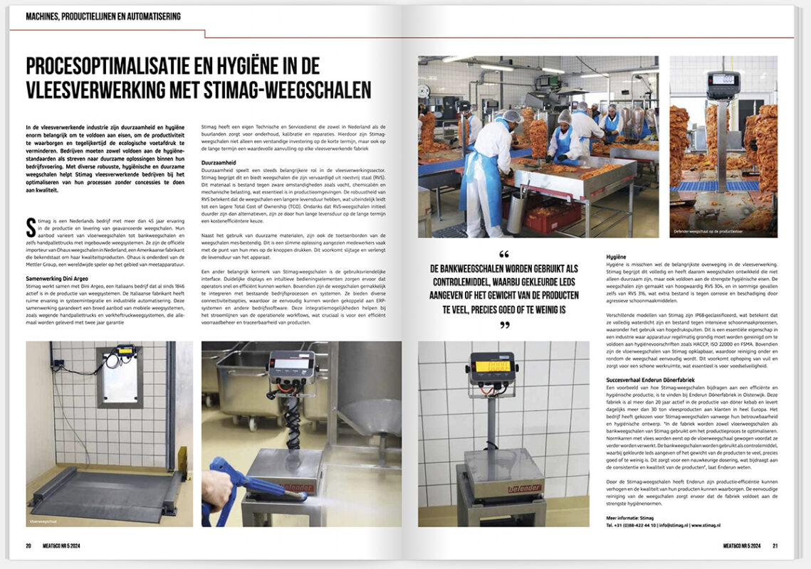 Een voorbeeld van hoe Stimag weegschalen bijdragen aan een efficiënte en hygiënische productie, is te vinden bij Enderun Dönerfabriek in Oisterwijk. Deze fabriek is al meer dan 20 jaar actief in de productie van döner kebab en levert dagelijks meer dan 30 ton vleesproducten aan klanten in heel Europa. Het bedrijf heeft gekozen voor Stimag weegschalen vanwege hun betrouwbaarheid en hygiënische ontwerp. “In de fabriek worden zowel vloerweegschalen als bankweegschalen van Stimag gebruikt om het productieproces te optimaliseren. Normkarren met vlees worden eerst op de vloerweegschaal gewogen voordat ze verder worden verwerkt. De bankweegschalen worden gebruikt als controlemiddel, waarbij gekleurde leds aangeven of het gewicht van de producten te veel, precies goed of te weinig is. Dit zorgt voor een nauwkeurige dosering, wat bijdraagt aan de consistentie en kwaliteit van de producten”, laat Enderun weten. Door de Stimag weegschalen heeft Enderun zijn productie-efficiëntie kunnen verhogen en de kwaliteit van hun producten kunnen waarborgen. De eenvoudige reiniging van de weegschalen zorgt ervoor dat de fabriek voldoet aan de strengste hygiëne normen.